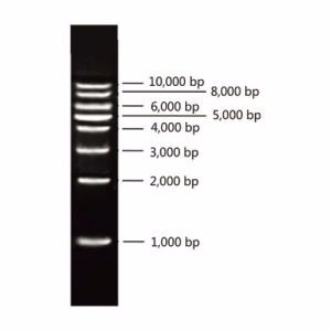 1 kb Ladder由8條DNA片段組成,分別為1 kb、2 kb、3 kb、4 kb、5 kb、6 kb、8 kb和10 kb。本產(chǎn)品為已含有1×Loading Buffer的DNA溶液,可取5 μl直接電泳,使用十分方便;電泳時(shí)5 kb的DNA片段量約為150 ng,顯示亮帶,其他條帶的DNA量約為50 ng。